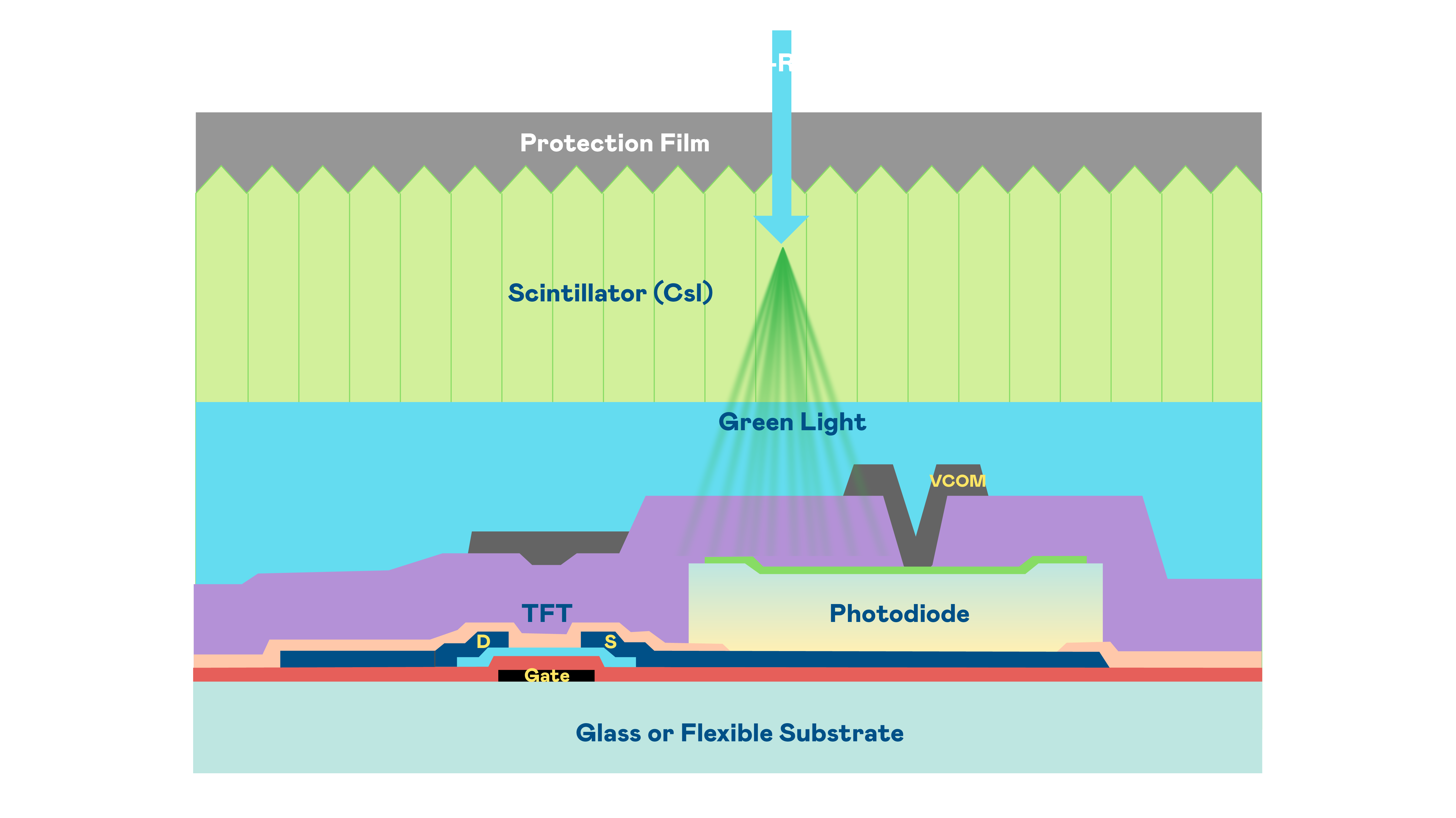 九游的X光影像感測陣列使用薄膜電晶體 (TFT) 作為每個像素的讀取開關,搭配光電二極體(Photodiode)的光電轉換元件,用以感測X光影像訊號。